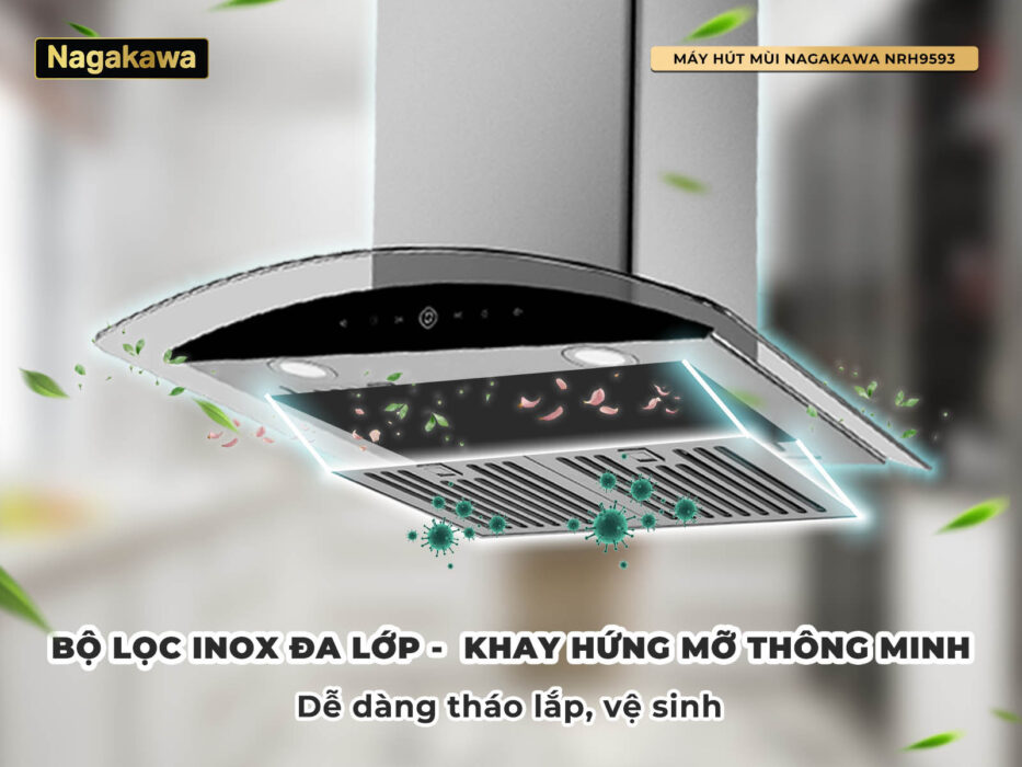 Khay hứng mỡ thông minh của Máy hút mùi Nagakawa NRH9593 được thiết kế dễ dàng tháo rời và vệ sinh, giúp bạn loại bỏ dầu mỡ thừa một cách nhanh chóng và tiện lợi, giữ căn bếp luôn sạch sẽ và gọn gàng.