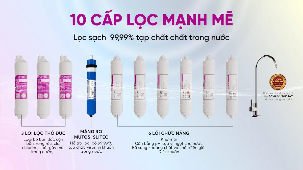 10 cấp lọc mạnh mẽ – Lọc sạch 99,99% tạp chất trong nước
