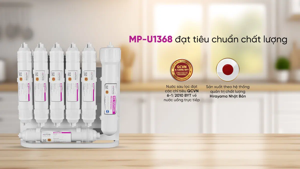 - Nước được tái tạo từ MP-U1368 đảm bảo loại bỏ được 13+6 chất độc hại, đáp ứng tiêu chuẩn Nhật Bản JIS S3201 & JWPA