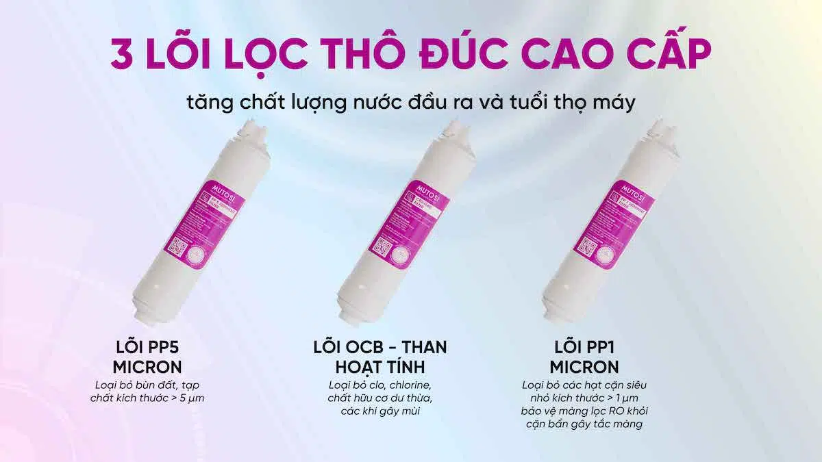 - 3 lõi lọc thô: không chỉ giúp loại bỏ rong rêu, bùn đất, rỉ sét, cát…có kích thước nhỏ đến 1 micron và các chất gây hữu cơ mà còn góp phần bảo vệ màng lọc RO khỏi cặn bẩn gây bít tắc màng