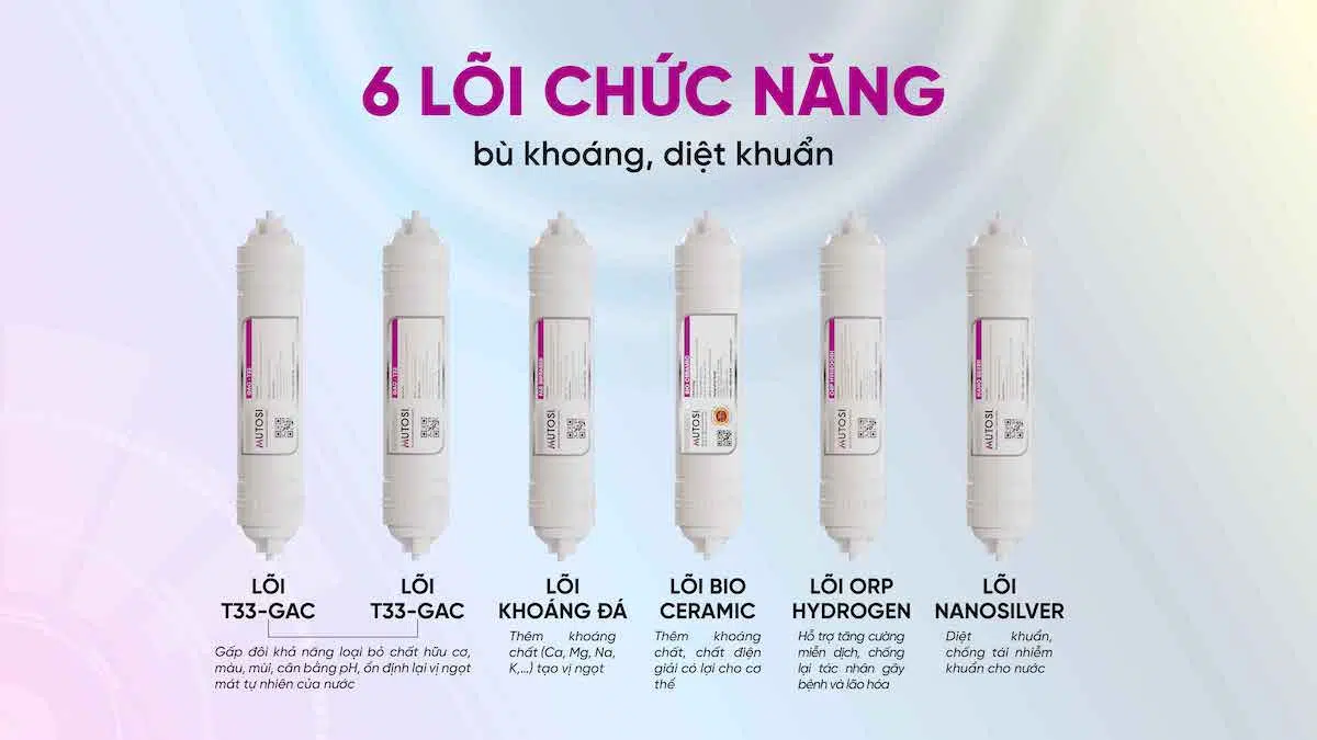 - 6 lõi chức năng bao gồm: 2 lõi T33-GAC lõi Nano bạc, Lõi ORP Hydrogen, kết hợp cùng Lõi Bio Ceramic & Lõi khoáng đá, làm tăng hiệu quả khử mùi, diệt khuẩn, tăng thêm vị ngọt, bổ sung khoáng chất và điện giải có lợi cho sức khỏe.
