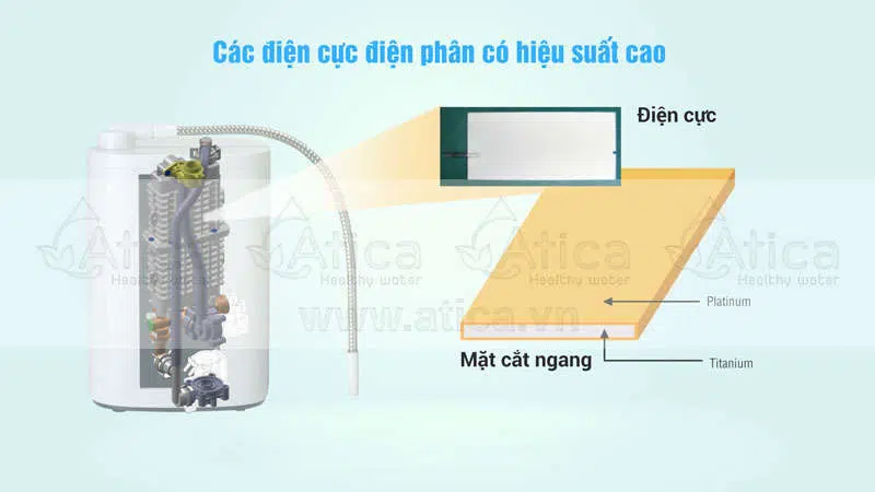Cơ chế làm việc của Atica Việt Nam: Nước sau khi qua bộ lọc đạt tiêu chuẩn nước uống trực tiếp sẽ được đưa vào buồng điện phân, cơ chế điện phân giúp tạo ra nước ion kiềm giàu hydro tại điện cực âm bao gồm:canxi, magie, H2, OH–