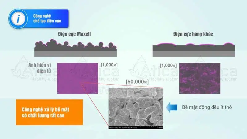 Sự khác biệt của công nghệ sản xuất điện cực của Atica đó là khả năng tạo ra bề mặt gồ ghề cao của Titanium, công nghệ phủ Platinum đồng nhất trên bề mặt điện cực(nền Titanium), không sử dụng axit hydro floric trong quá trình xử lý bề mặt điện cực, điều này mang lại những lợi thế vượt trội của Atica: