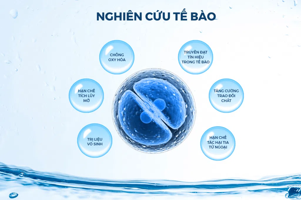 Các dữ liệu đạt được thông qua nghiên cứu tế bào mang tính hỗ trợ quan trọng cho việc giải mã cơ chế tác động của Hydro phân tử trên phương diện Sinh vật học phân tử, trong đó Hydro nổi bật với 6 công dụng: Chống oxy hóa, Truyền dạt tín hiệu trong tế bào, Hạn chế tích lũy mỡ, Tăng cường trao đổi chất, Trị liệu vô sinh, Hạn chế tác hại tia tử ngoại