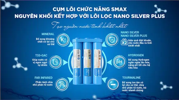 Cụm lõi lọc Smax hiệu suất cao cung cấp nhiều khoáng chất tốt kết hợp thêm lõi Nano Silver Plus giúp gấp đôi khả năng diệt khuẩn đảm bảo chất lượng nước đầu ra tinh khiết nhất.