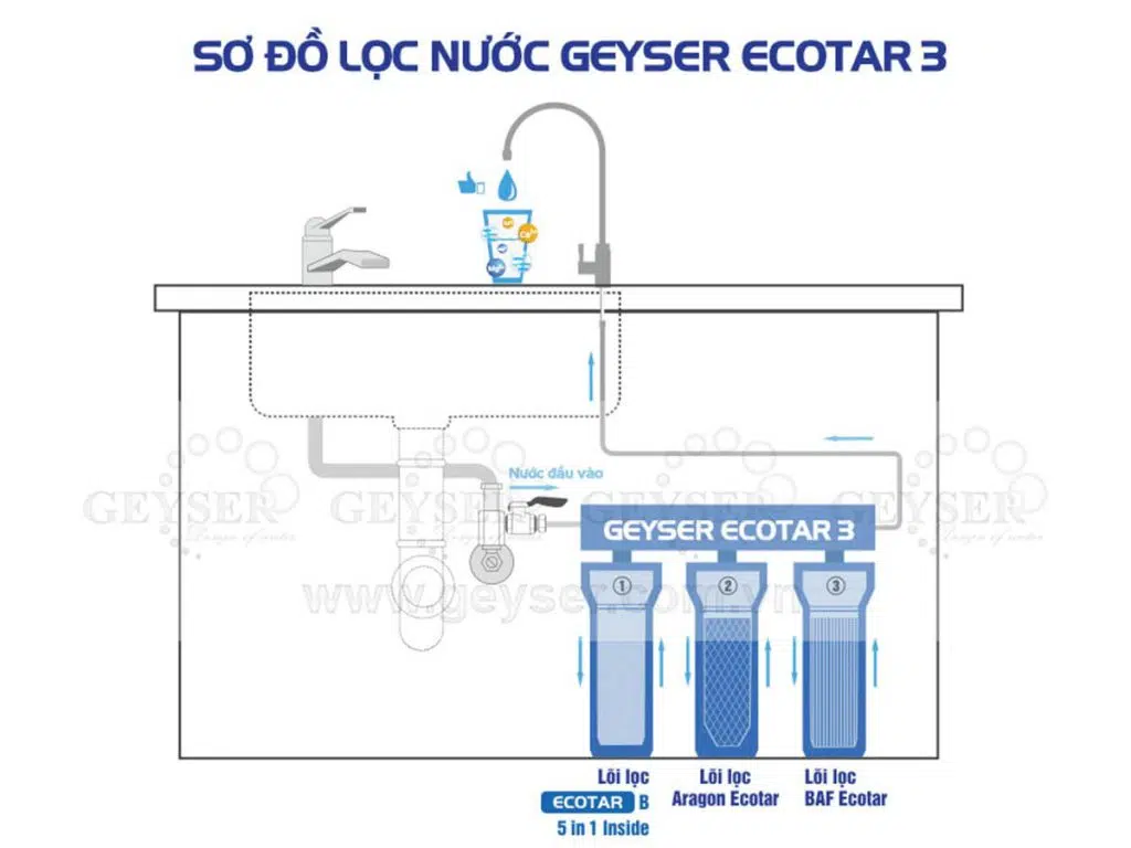 Geyser Ecotar 3 sử dụng các phiên bản lõi lọc mới nhất(Aragon New và BAF Ecotar ) và ECOTAR 5 in 1 tạo nên hơn 9 cơ chế lọc chỉ trong 3 lõi lọc.