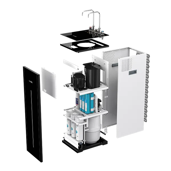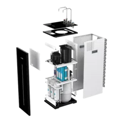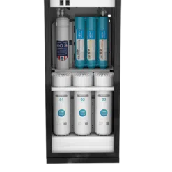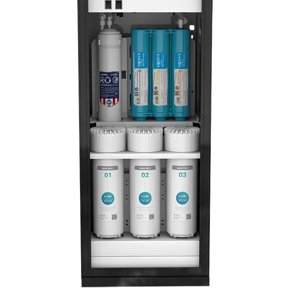 Phong cách thiết kế vô cùng thời thượng với tủ kính tràn viền sang trọng, hiện đại kết hợp cùng màu đen ấn tượng để người dùng có thể dễ dàng đặt bất cứ nơi nào trong nhà và nâng tầm không gian sống. Bên cạnh đó, kết cấu bên trong được thiết kế khoa học theo từng cụm linh kiện, tạo điều kiện thuận lợi cho việc thay thế lõi lọc.