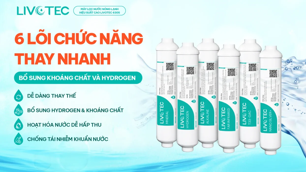 Máy lọc nước nóng lạnh Livotec 630S sở hữu 6 lõi chức năng thay nhanh dễ dàng thay thế, giúp bổ sung Hydrogen cùng các vi khoáng tự nhiên cần thiết cho cơ thể như Canxi, Magie…, giúp cơ thể dễ hấp thu nước, trung hòa các gốc tự do và chất oxy hóa, hỗ trợ tăng cường sức khỏe.