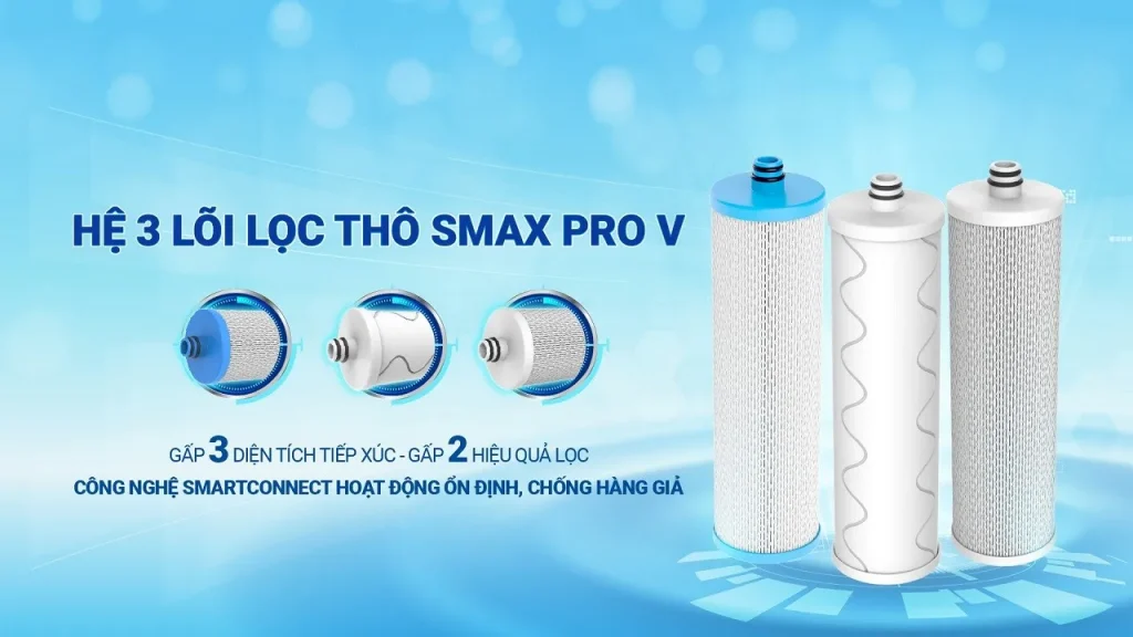 Hệ lõi lọc thô Smax Pro V 1,2,3 ứng dụng công nghệ Smart Connect giúp chống hàng giả, hàng nhái, hoạt động ổn định gấp đôi, bảo vệ hiệu quả hệ thống lọc. Bên cạnh đó, hiệu quả lọc cũng được nâng cao nhờ kết cấu rẻ quạt thông minh làm tăng gấp 3 lần diện tích tiếp xúc nước, lỗ lọc siêu nhỏ chỉ từ 1 micromet. Nhờ vậy, Smax Pro V loại bỏ sạch tạp chất, cặn bẩn, chất gây mùi, chất hữu cơ… có trong nước.
