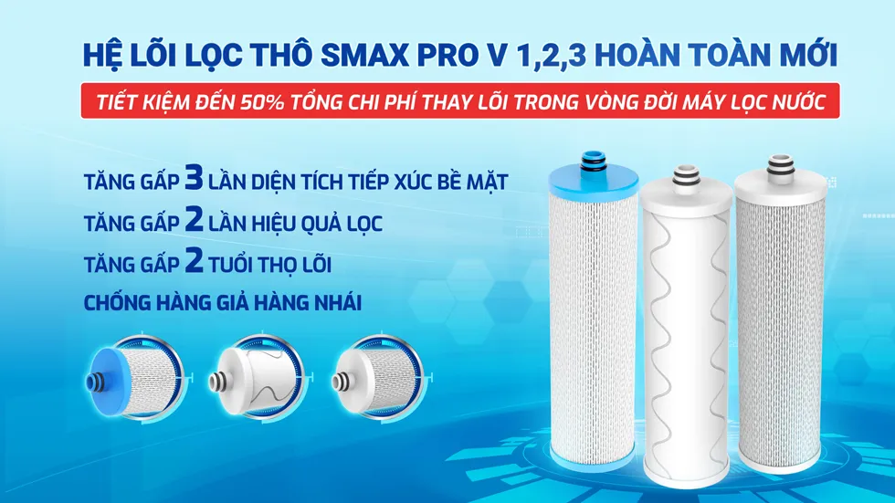 Hệ lõi lọc thô Smax Pro V 1,2,3 ứng dụng công nghệ Smart Connect giúp chống hàng giả, hàng nhái, hoạt động ổn định gấp đôi, bảo vệ hiệu quả hệ thống lọc. Kết cấu rẻ quạt thông minh làm tăng gấp 3 lần diện tích tiếp xúc nước, lỗ lọc siêu nhỏ chỉ từ 1 micromet giúp loại bỏ sạch tạp chất, cặn bẩn, chất gây mùi, chất hữu cơ… có trong nước.