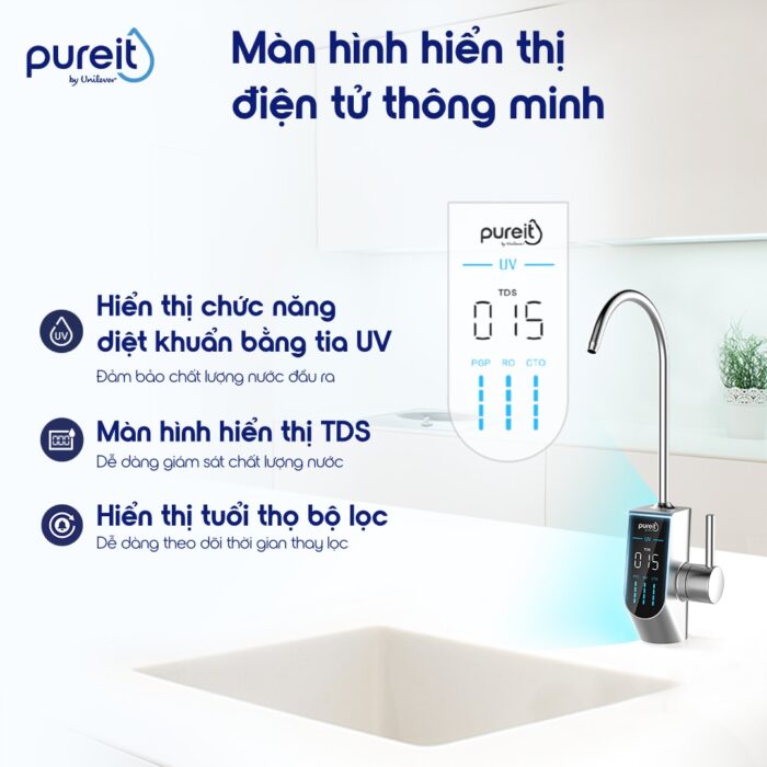 Đặc biệt, trên vòi nước còn tích hợp bảng điện tử hiển thị một loạt các chỉ số thông minh để giám sát và cảnh báo thay lõi lọc và chất lượng nguồn nước. Khi nước chảy ra, trên bảng điện tử sẽ hiển thị chỉ số TDS để người dùng nhận biết độ tinh khiết của nước. Chỉ số TDS từ 0 – 100 ppm cho thấy nước an toàn để uống, từ 100 – dưới 400 ppm là nước chỉ dùng trong sinh hoạt.
