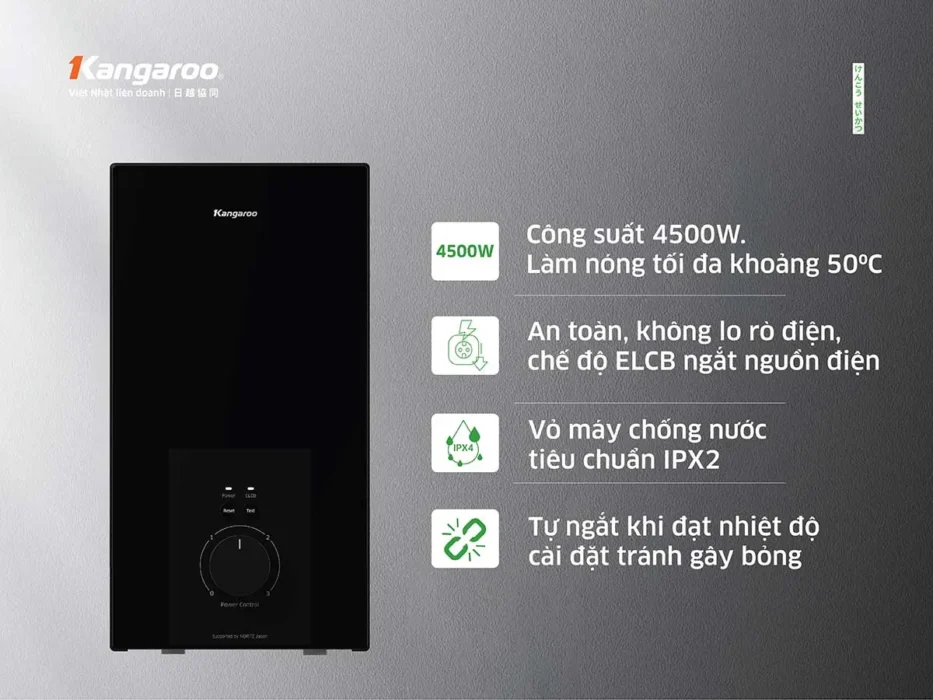 - Cầu dao ELCB: Máy nước nóng Kangaroo KGWD45N2 sử dụng hệ thống cầu dao ELCB tự động ngắt khi rò rỉ điện, cùng 2 chế độ test ELCB đảm bảo an toàn vượt trội.