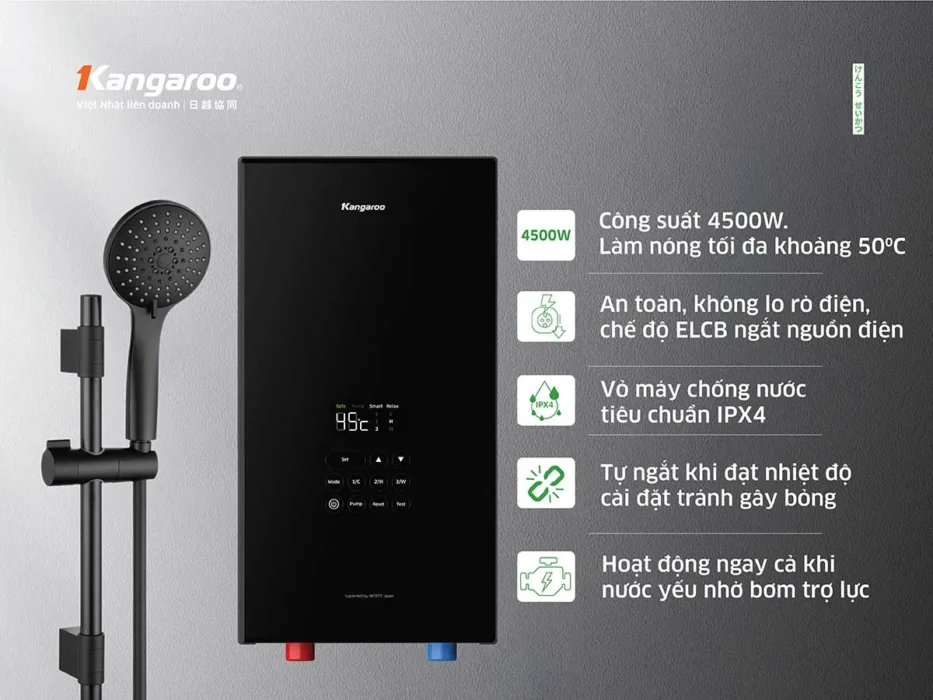 - Cầu dao ELCB: Máy nước nóng Kangaroo KGWD45P1 sử dụng hệ thống cầu dao ELCB tự động ngắt khi rò rỉ điện, cùng 2 chế độ test ELCB đảm bảo an toàn.
