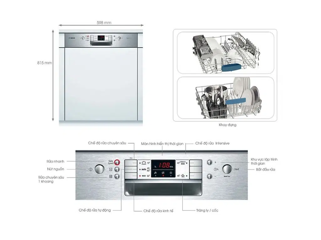 Máy rửa bát Bosch SMI53M75EU được thiết kế âm tủ làm tăng thêm sự sang trọng cho gian bếp nhà bạn. Máy được nhập khẩu nguyên chiếc từ Đức với tiêu chuẩn chất lượng hàng đầu châu âu