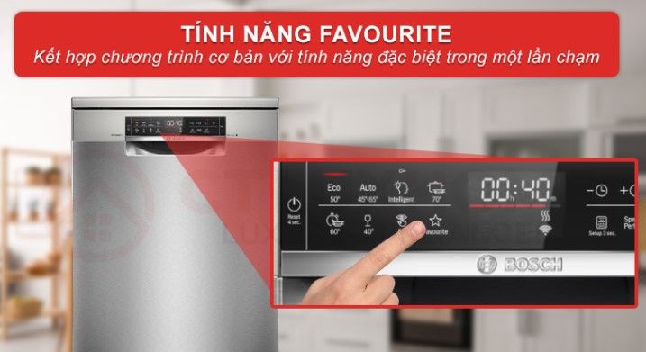 Để thiết lập tính năng Favourite, người dùng chỉ cần lựa chọn 1 chương trình cơ bản với tính năng đặc biệt. Chẳng hạn như bạn kết hợp chương trình rửa Eco 50 độ với sấy tăng cường ExtraDry. Sau đó nhấn giữ nút Favourite trong vòng 3 giây để lưu lại chương trình.
