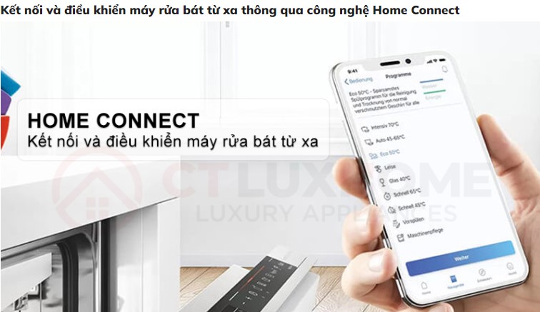 - Dễ dàng điều khiển máy rửa bát từ xa: Sử dụng Home Connect sẽ giúp bạn dễ dàng điều khiển máy rửa bát mà không cần lại gần máy. Tất cả những gì bạn phải làm là nhập số lượng, chất liệu và độ bẩn ngay trên ứng dụng. Home Connect sẽ đề xuất chương trình rửa phù hợp nhất dành cho bạn. Ngoài ra, bạn cũng có thể chủ động lựa chọn chương trình tùy theo nhu cầu sử dụng.