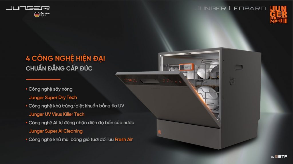 Vượt trội so với các sản phẩm cùng loại trên thị trường, Junger Leopard DWJ-103 được ứng dụng 4 công nghệ hiện đại bao gồm: công nghệ sấy nóng Junger Super Dry Tech, công nghệ khử trùng/diệt khuẩn bằng tia UV Junger UV Virus Killer Tech, công nghệ AI tự động Junger Super AI Cleaning và công nghệ khử mùi bằng gió tươi đối lưu Fresh Air.