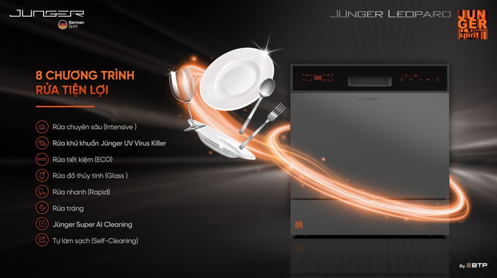 Máy rửa bát Junger Leopard DWJ-103 cung cấp 8 chương trình rửa giúp làm sạch nhanh chóng, toàn diện và tiết kiệm điện nước hiệu quả, bao gồm: rửa chuyên sâu (Intensive), rửa khử khuẩn Junger UV Virus Killer, rửa tiết kiệm (ECO), rửa đồ thủy tinh (Glass), rửa nhanh (Rapid), rửa tráng, Junger Super AI Cleaning và tự làm sạch (Self-Cleaning).