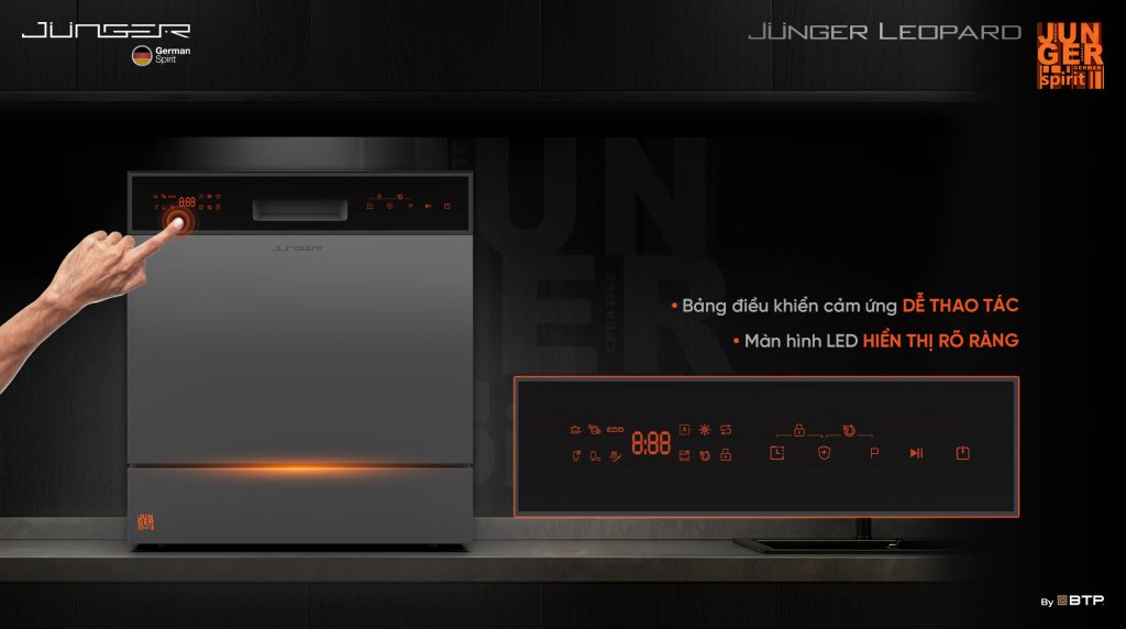 Bảng điều khiển cảm ứng được thiết kế trực quan, dễ hiểu thuận tiện cho người dùng khi thao tác trên máy rửa bát Junger Leopard DWJ-103. Màn hình đèn LED hiển thị rõ ràng sắc nét các thông tin về chương trình, tính năng, các thông số về thời gian, chỉ số muối, chất làm bóng và các lỗi có thể xảy ra giúp bạn theo dõi và kiểm soát hoạt động của thiết bị tốt hơn.