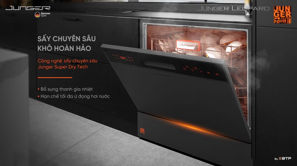 Máy rửa bát Junger Leopard DWJ-103 nổi bật với công nghệ sấy nóng Junger Super Dry Tech sử dụng thanh gia nhiệt kết hợp lượng nhiệt tồn dư của nước nóng sinh ra trong quá trình rửa. Hệ thống quạt gió đối lưu hỗ trợ làm khô tăng cường cho toàn bộ chén bát tốt hơn, giúp tiết kiệm năng lượng hiệu quả với công nghệ tái tạo năng lượng.