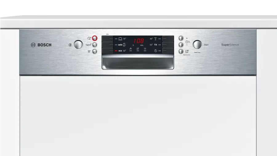 Máy rửa bát Bosch SMI46KS01E sử dụng Bảng điều khiển điện tử kết hợp cơ hiển thị thời gian còn lại trong vài phút, hiển thị lượng chất rửa và muối rửa trên màn hình