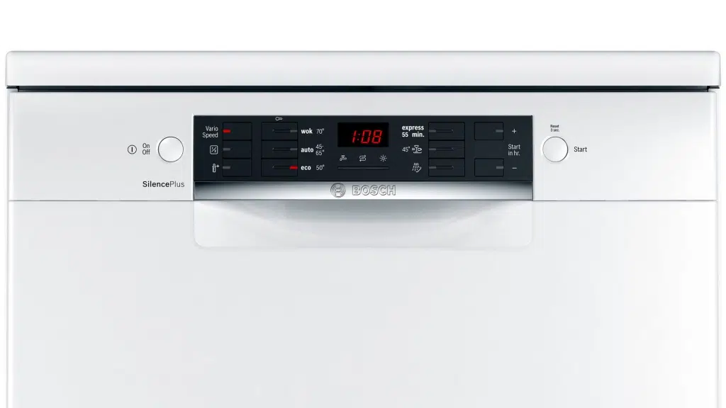 Máy rửa bát Bosch SMS46GW01P sử dụng bảng điều khiển cơ kết hợp điện tử, màn hình Led với độ phân giải cao hiển thị các biểu tượng đồ họa và văn bản đơn giản.