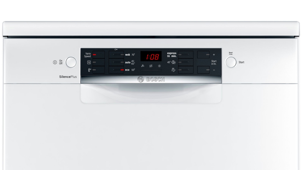 Máy rửa bát Bosch SMS46GW01P sử dụng bảng điều khiển cơ kết hợp điện tử, màn hình Led với độ phân giải cao hiển thị các biểu tượng đồ họa và văn bản đơn giản.