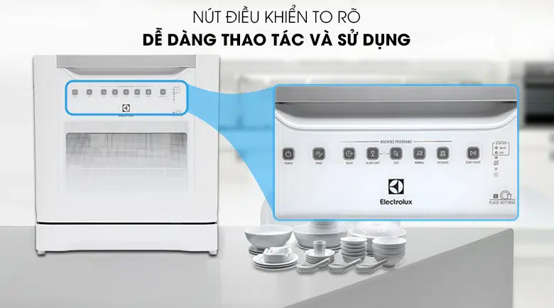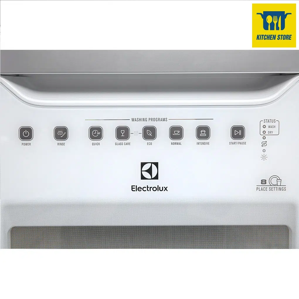 Máy rửa bát Electrolux mini với công suất 1480W rửa bát đĩa nhanh chóng, sạch bóng một cách dễ dàng và có thể rửa 8 bộ đồ ăn châu Âu, tương đương với 2 bữa ăn Việt của gia đình từ 2 – 3 người.