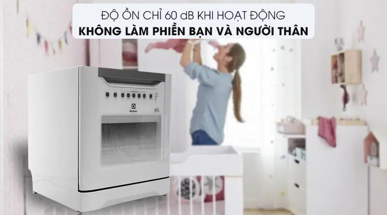 Máy rửa bát hoạt động êm ái với độ ồn chỉ 60 dB (tương đương với nghe nhạc nhẹ), không hề làm ảnh hưởng đến sinh hoạt của các thành viên trong gia đình, kể cả khi bạn thư giãn, cho trẻ em ngủ,…