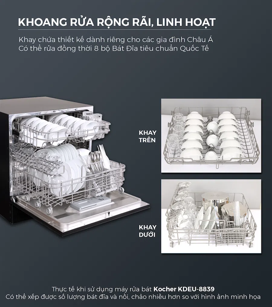 Khay chứa được thiết kế dành riêng cho các gia đình Châu Á có thể rửa đồng thời 8 bộ bát đĩa theo tiêu chuẩn Châu Âu.