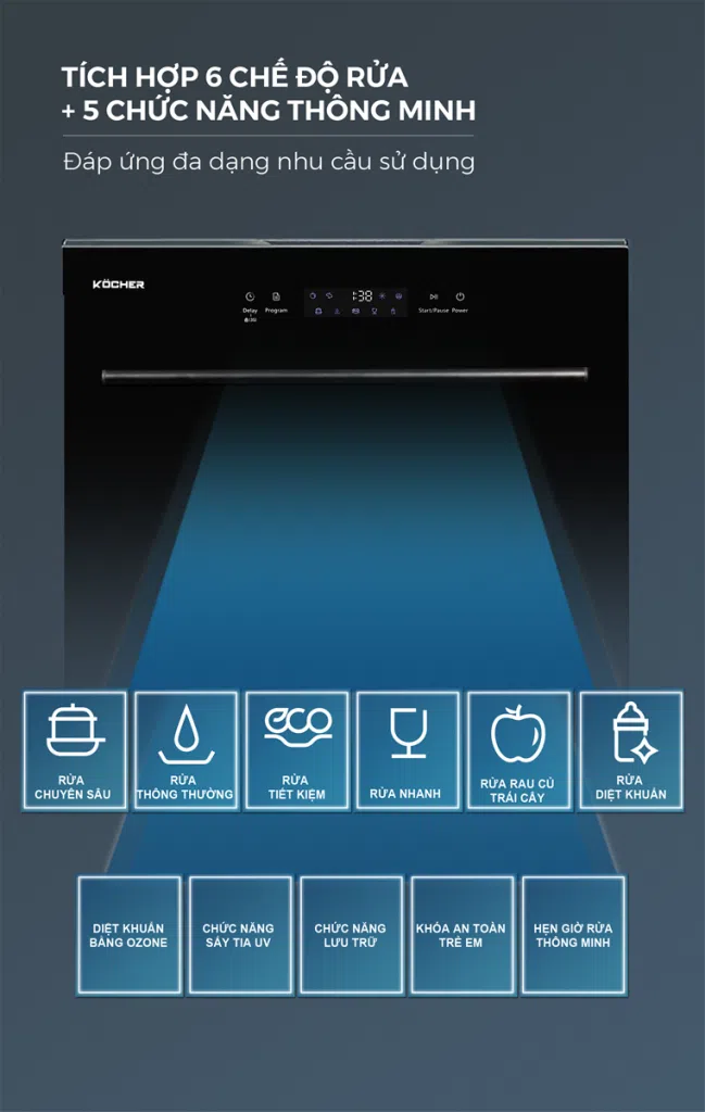Máy rửa bát Kocher KDEU-8839 được tích hợp 6 chương trình rửa bao gồm rửa chuyên sâu, rửa thường, rửa tiết kiệm, rửa nhanh, rửa rau củ trái cây, rửa diệt khuẩn cùng với 5 chức năng thông minh như: Diệt khuẩn bằng Ozone, chức năng sấy bằng tia UV, chức năng lưu trữ, khóa an toàn trẻ em, hẹn giờ rửa thông minh.