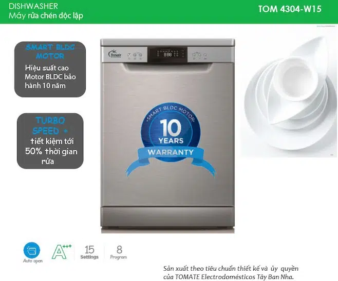 Máy rửa chén TOM 4304-W15 với sức chứa 15 bộ đồ ăn âu, 8 chức năng rửa
