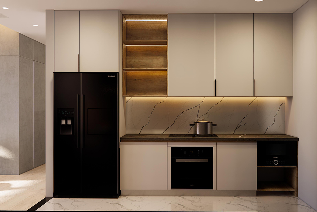 - Tích hợp thiết bị thông minh – Máy hút mùi, kệ nâng, tủ kéo giúp bếp hiện đại và tiện nghi hơn.