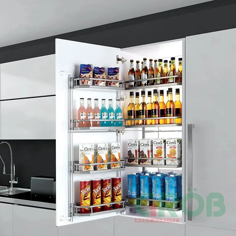 - Thay vì xếp đồ đạc một cách không khoa học tạo nên sự bề bộn cho bếp thì tủ kho sẽ đem tới cho bạn sức chứa vô cùng lớn giúp căn bếp luôn sạch sẽ, gọn gàng. Với thiết kế 4 tầng, 8 rổ đựng. bạn có thể tha hồ cất gọn tất cả các vật dùng, đồ ăn vào khoang tủ phía sau cánh cửa tủ.