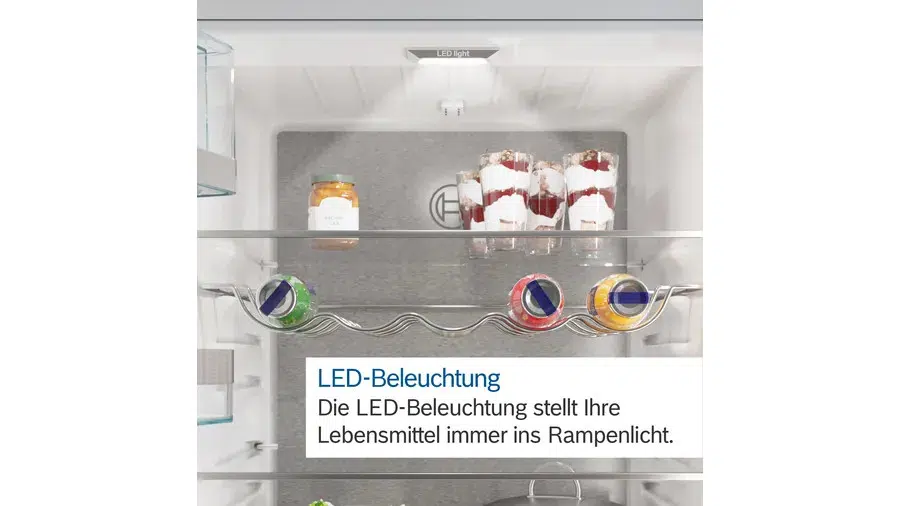 Đèn LED mang đến một khái niệm chiếu sáng hoàn toàn mới cho tủ lạnh, đảm bảo chiếu sáng nội thất đồng đều, không chói. Đèn LED sử dụng ít điện hơn đèn tủ lạnh thông thường và kéo dài tuổi thọ (thiết bị).