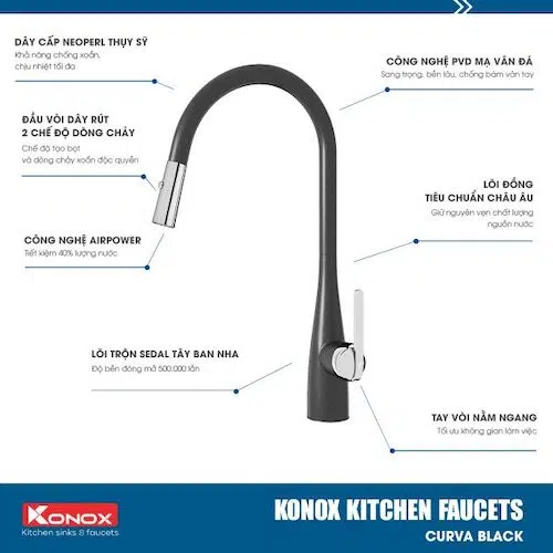 Công nghệ vòi rửa bát rút dây Konox Curva Black