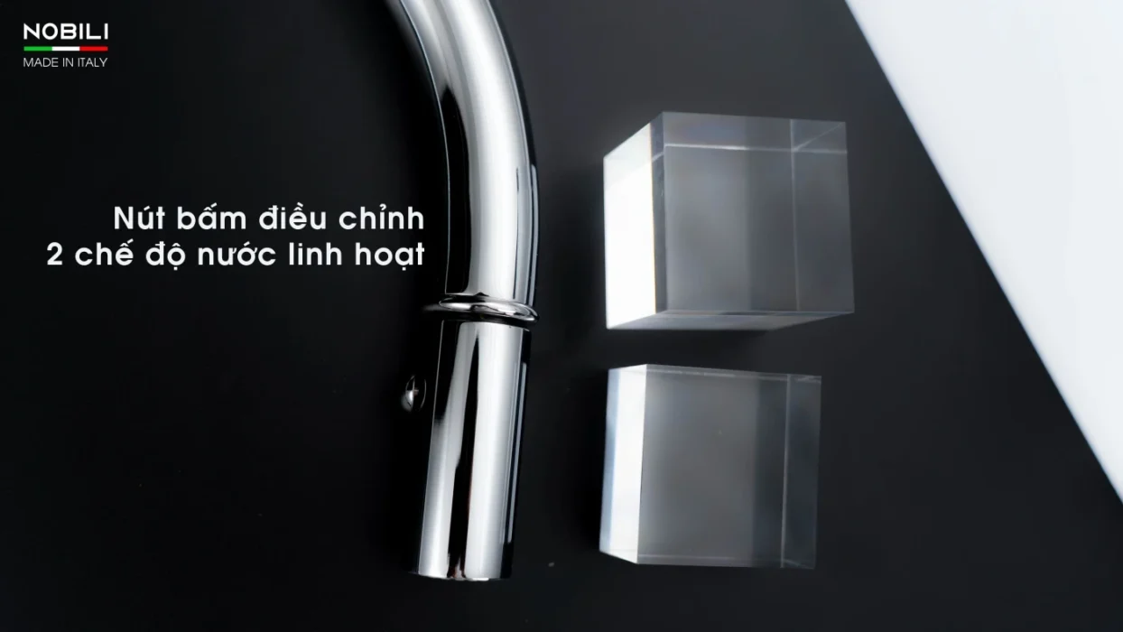 Đầu vòi của Nobili RING NB131L được thiết kế với 2 chế độ nước: tạo bọt và phun mưa, giúp người dùng chuyển đổi linh hoạt theo từng nhu cầu sử dụng – từ rửa rau củ nhẹ nhàng đến làm sạch xoong nồi hiệu quả. Nút bấm được tích hợp ngay đầu vòi cho phép thao tác nhanh gọn, mang lại trải nghiệm tiện lợi và tiết kiệm nước tối ưu trong mỗi lần sử dụng.