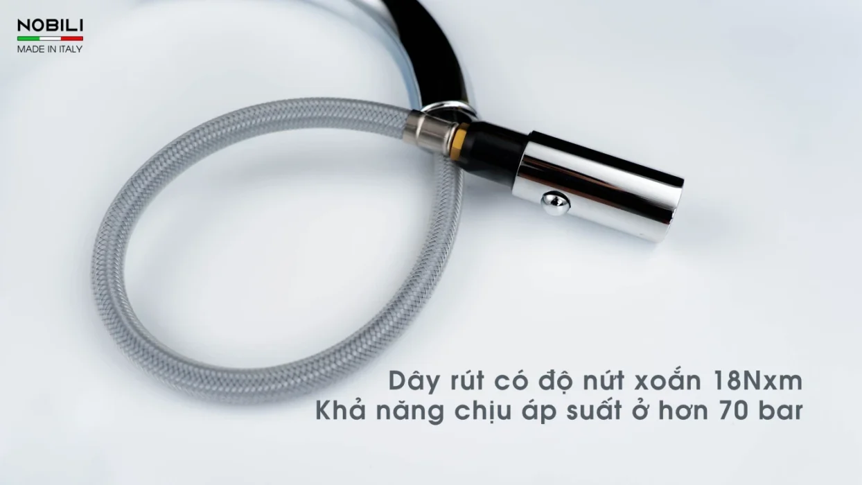 Không chỉ linh hoạt, dây rút cao cấp của các dòng vòi rửa bát dây rút Nobili còn chịu được áp lực nước vượt 70 bar, cho thấy khả năng vận hành ổn định trong điều kiện áp suất mạnh. Nhờ đó, dòng nước luôn duy trì mạnh mẽ, hỗ trợ rửa sạch hiệu quả mà không ảnh hưởng đến độ bền của hệ thống.