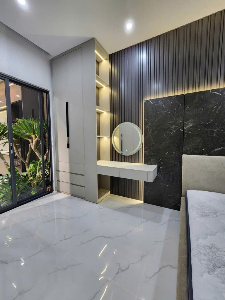 Thi công nội thất phòng ngủ: giường, tủ áo, bàn trang điểm.