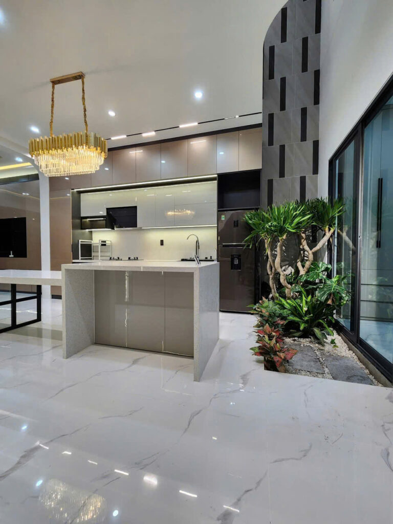 Thi công nội thất phòng bếp: tủ bếp, bàn ăn, đảo bếp tiện nghi.
