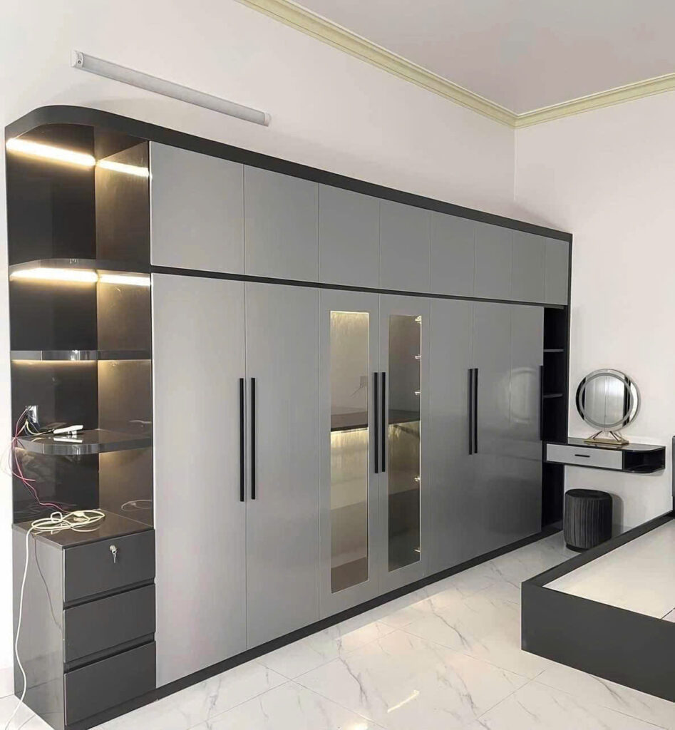 Thi công nội thất phòng ngủ: giường, tủ áo, bàn trang điểm.