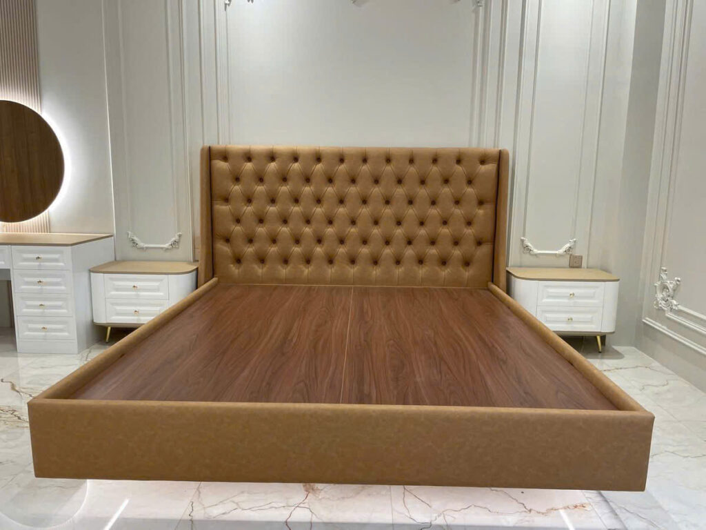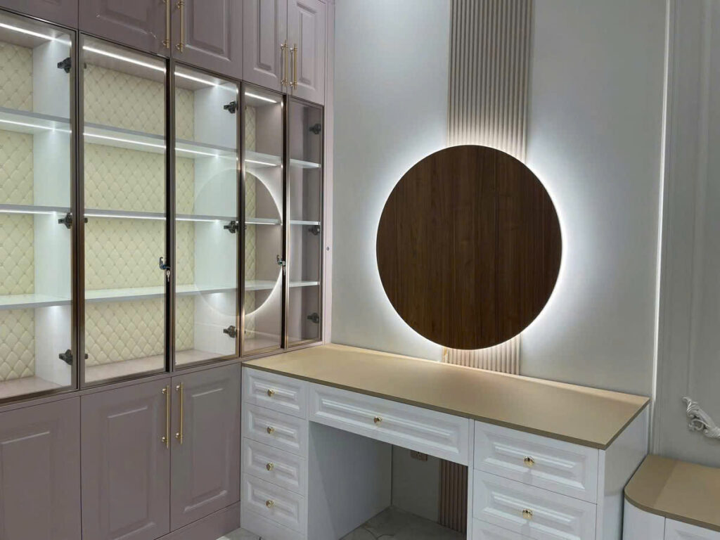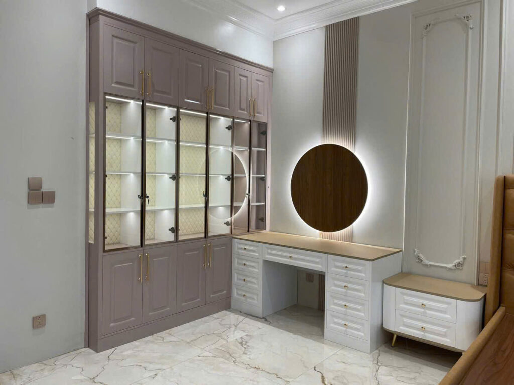 Thi công nội thất phòng ngủ: giường, tủ áo, bàn trang điểm.