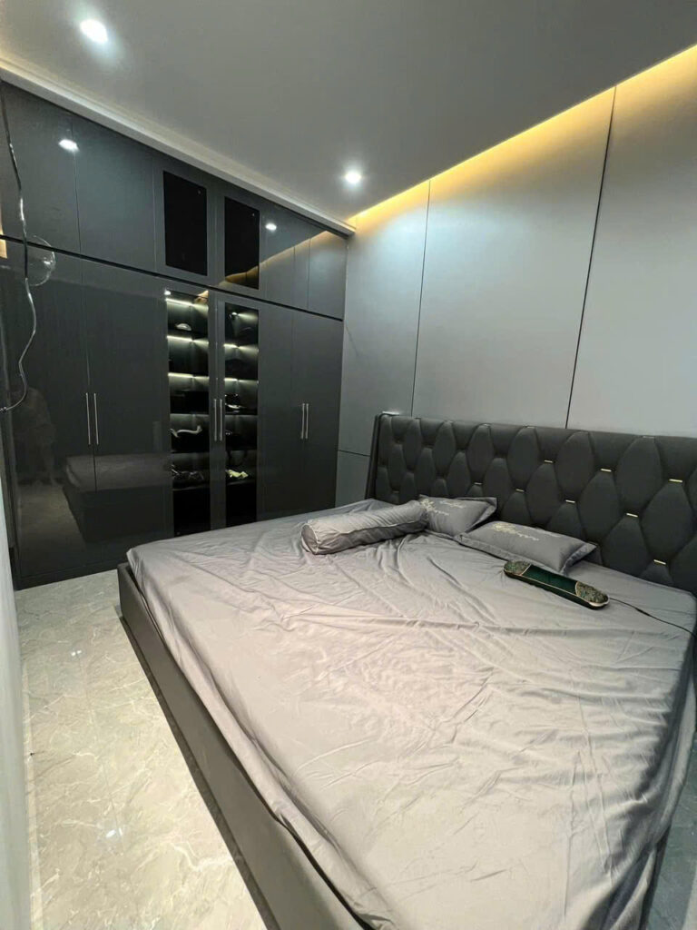 Thi công nội thất phòng ngủ: giường, tủ áo, bàn trang điểm.